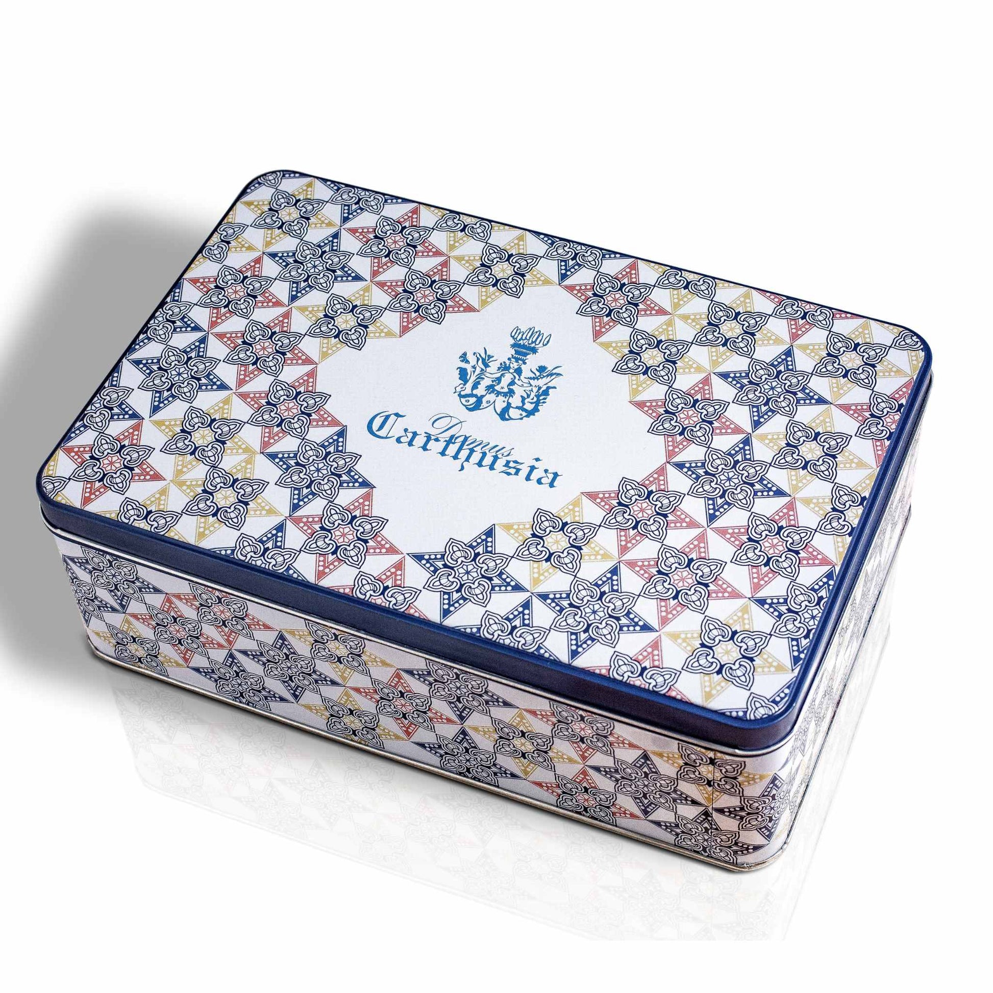 - Hübsche Geschenkbox: Große Blechbox bedruckt in den typischen Farben und Mustern der Amalfiküste.