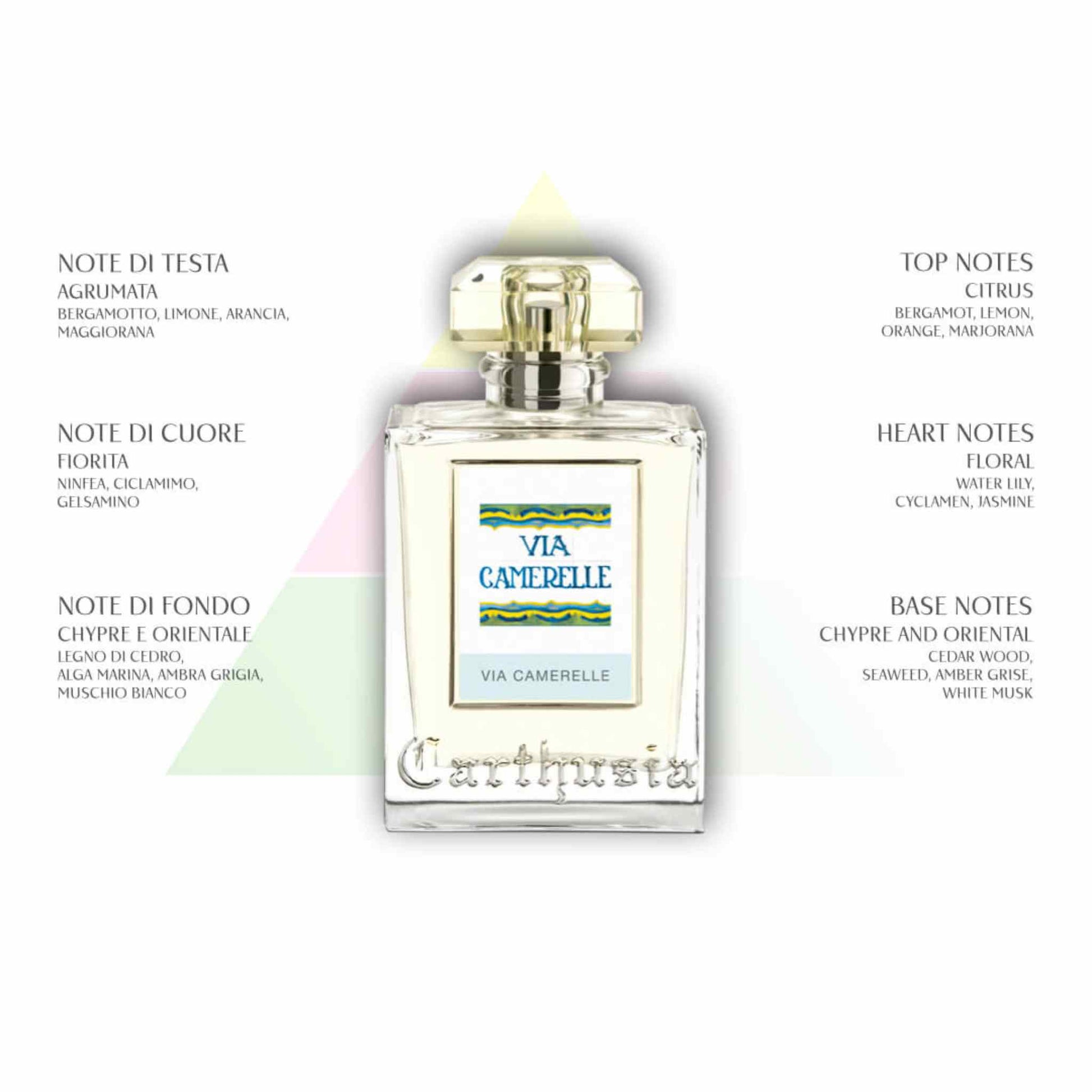 Via Camerelle ist eine Hommage an das mediterrane Lebensgefühl – frisch, blumig und elegant. Der Duft eröffnet mit einer spritzigen Zitruskomposition aus Bergamotte, Zitrone, Orange und Majoran. Im Herzen entfaltet sich eine florale Melange aus Seerose, Alpenveilchen und Jasmin, die eine leichte, luftige Note verleiht. Die Basisnote sorgt mit Zedernholz, Meeresalgen, grauem Amber und weißem Moschus für eine warme, leicht orientalische Tiefe.