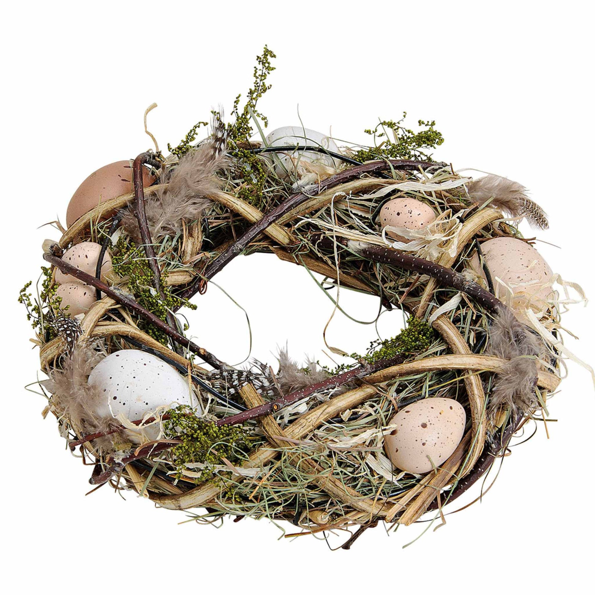 Authentisches Design: Der dekorative Osterkranz in Naturfarben kombiniert natürliche Zweige mit zarten Kunst-Eiern und filigranen Federn – für eine stilvolle, saisonale Dekoration.